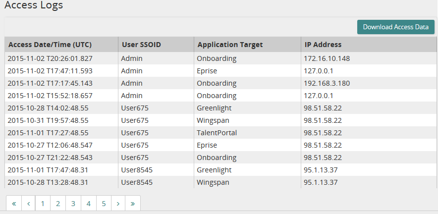 Use the Access Logs page to see users who have successfully accessed a Life Suite module. The page shows date and time of access, user ID, application target (initial Life Suite module accessed), and user IP address. Buttons, links, and options