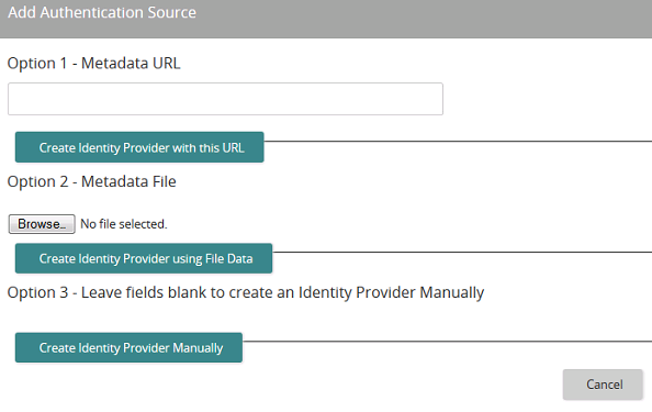 For details about each option, refer to Adding IdP authentication sources. After you add an authentication source, you must enable it. Fields, buttons, links and options Option 1 - Metadata URL If you have a public URL where your metadata file is stored, enter your URL here.