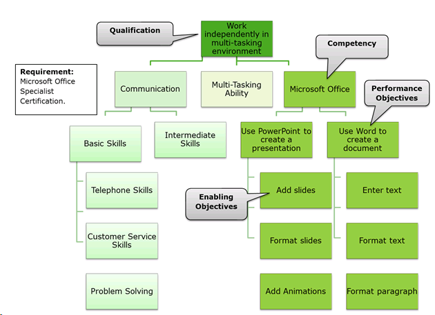 - Enabling Objectives – smaller tasks, skills, or knowledge that are needed to master a Performance Objective