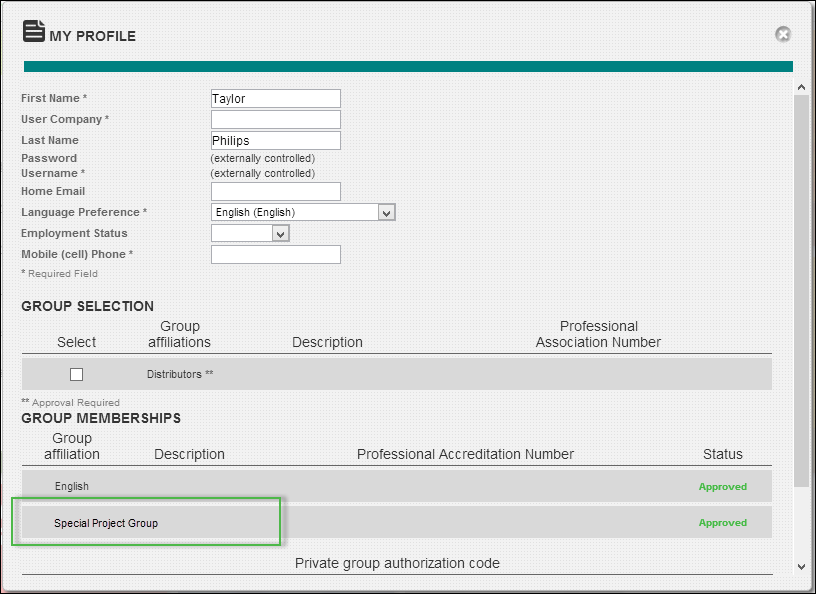 Groups are displayed on the My Profile page. This student is a member of the Special Project Group.